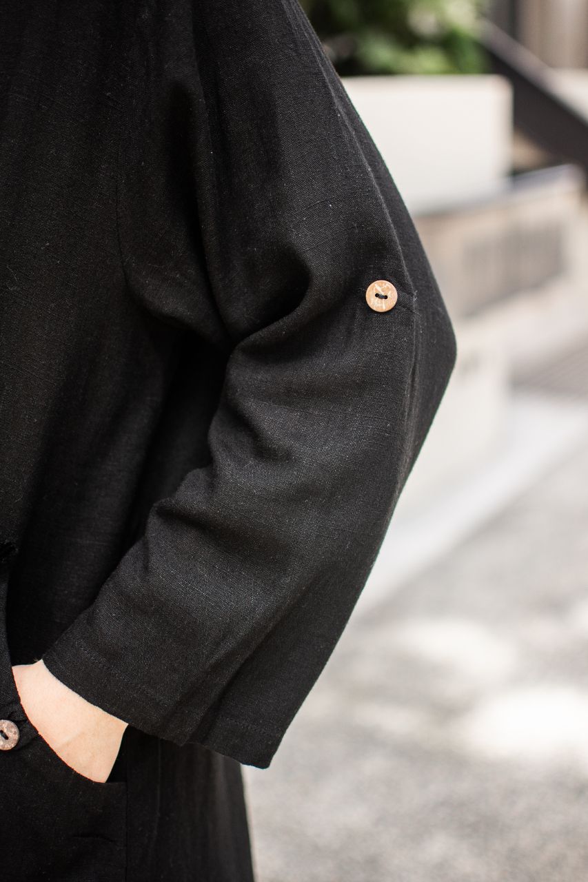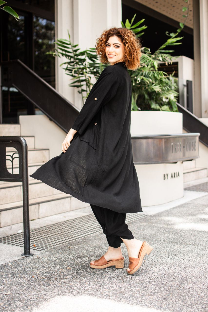 Make a bold, elegant statement with this long black tunic, designed for those who appreciate style and comfort. Featuring a flowing, relaxed silhouette and subtle button details on the sleeves, this tunic is versatile enough to be dressed up or down. Crafted from a lightweight, breathable fabric, it pairs beautifully with trousers or leggings for an effortlessly chic look. Ideal for layering or wearing on its own, this tunic is perfect for any occasion where style meets ease.