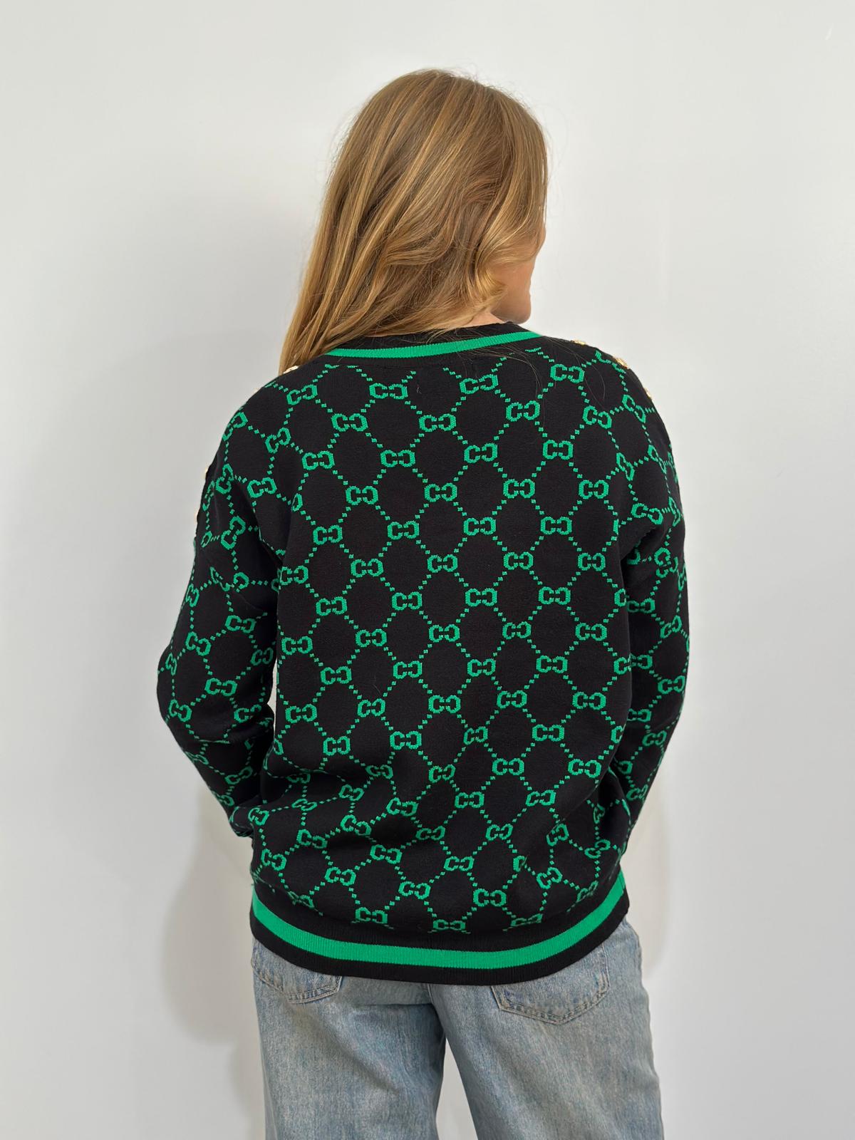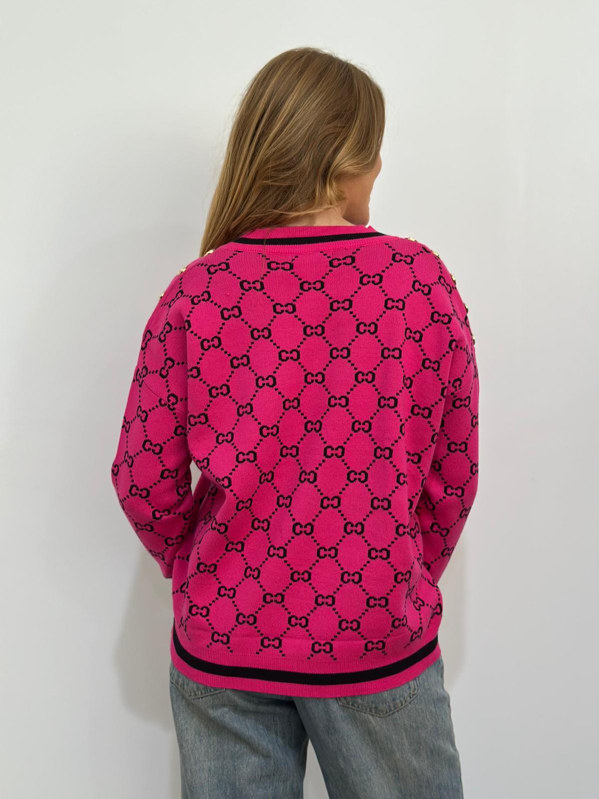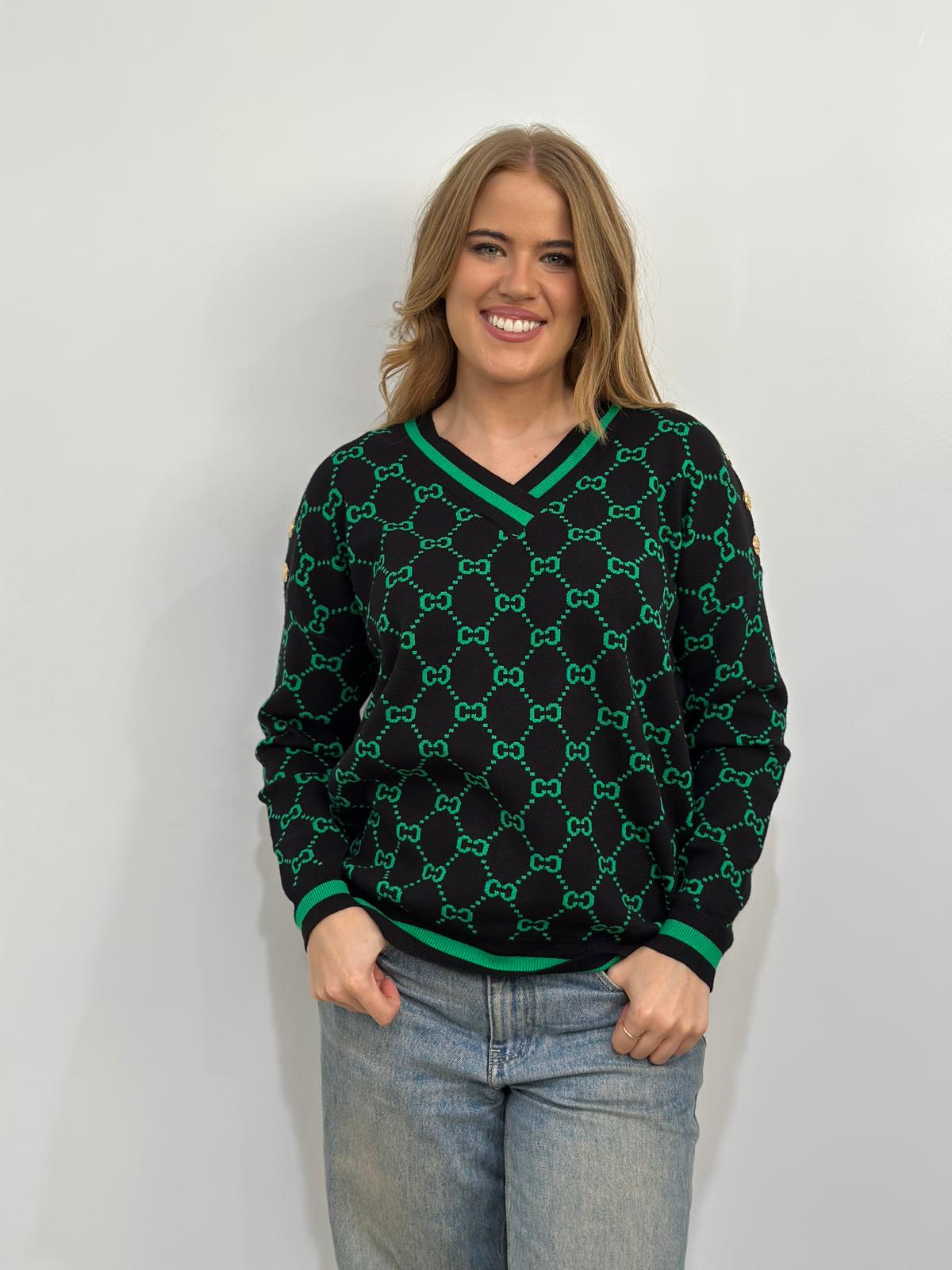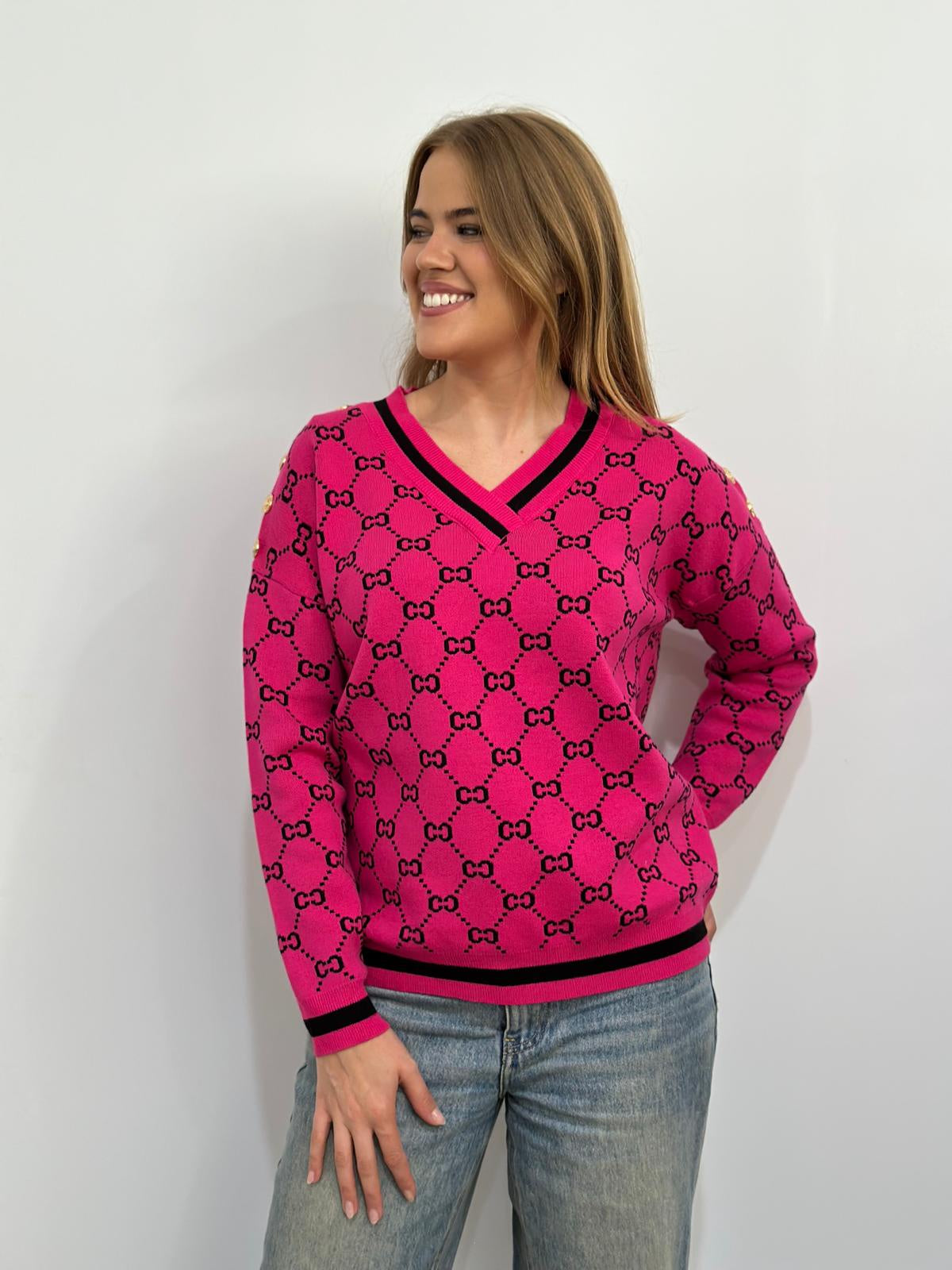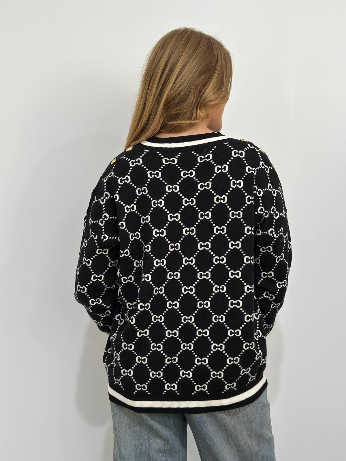 Turn heads in the Chain Reaction Sweater, where graphic edge meets elevated street chic. This bold monogram-inspired knit features an all-over linked pattern with contrast trim detailing for a punchy, fashion-forward look.