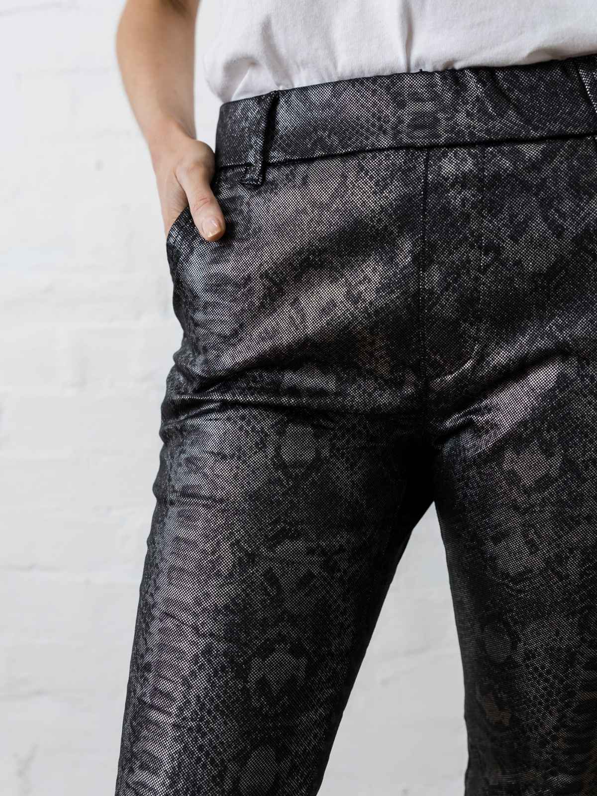 These textured slim-fit pants are the perfect blend of comfort and sophistication. Designed with a subtle geometric pattern woven through the fabric, they add gentle dimension and polish to any outfit. The mid-rise waist offers a flattering silhouette, while the slim leg creates a clean and elongating line.