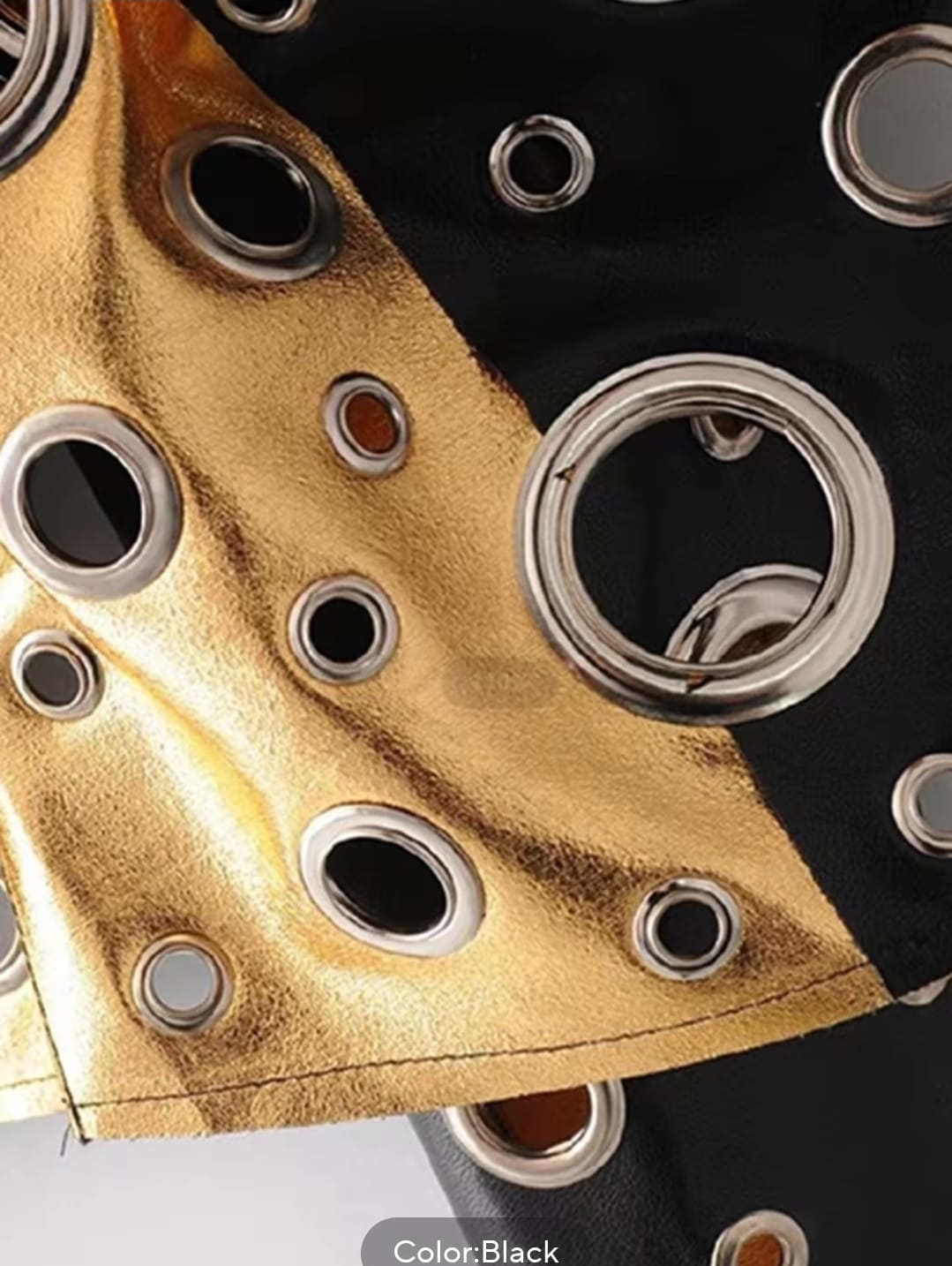 The open-front style creates a sharp, modern shape that layers effortlessly over fitted tops or dresses. Carefully placed eyelets add texture, depth, and attitude, making this piece a true standout in any wardrobe.