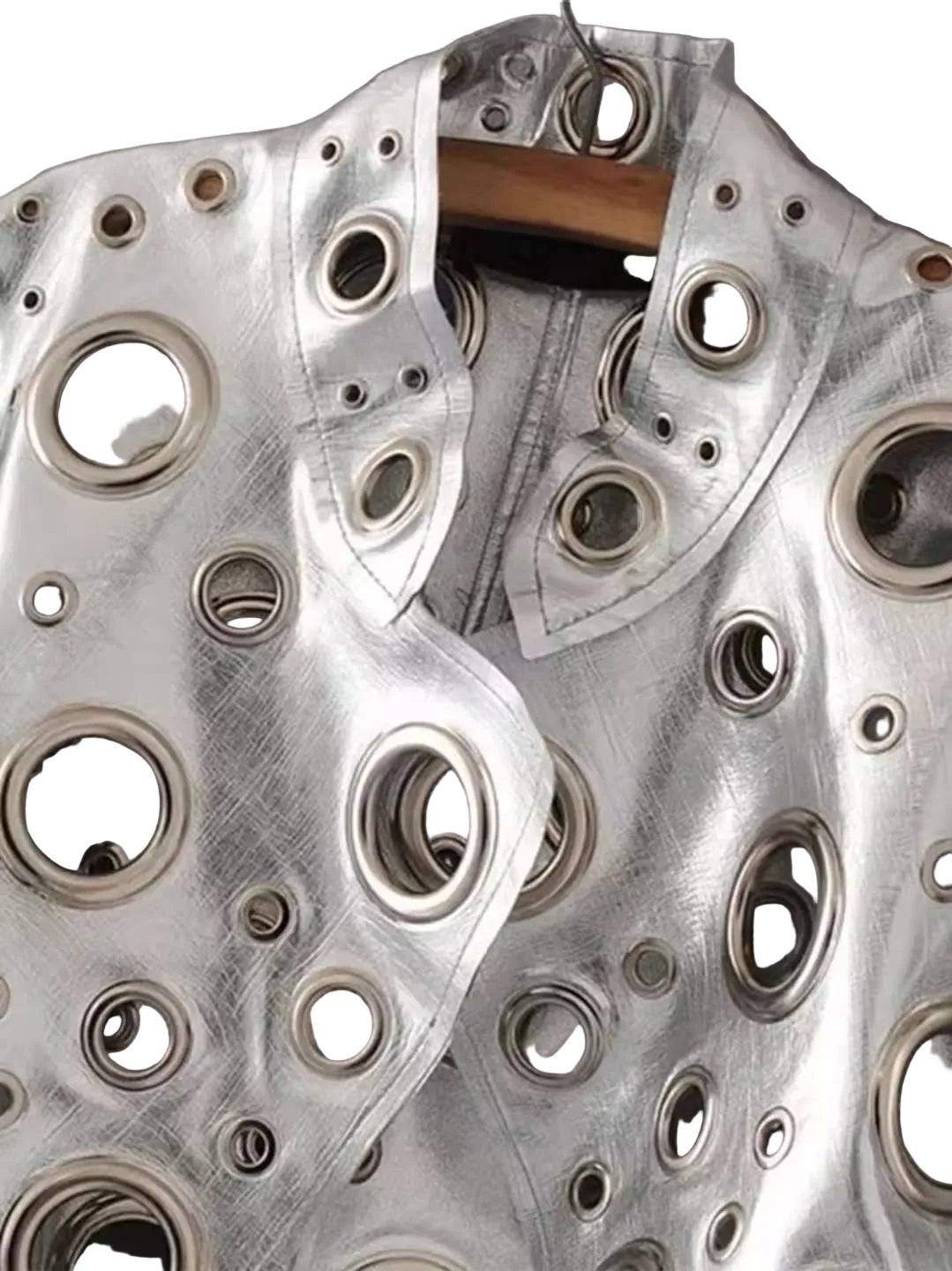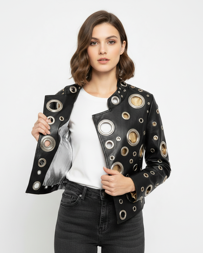 This bold faux leather jacket is designed to turn heads. Featuring an all-over metal eyelet design, it delivers a striking, high-fashion edge while maintaining a structured, wearable silhouette.
