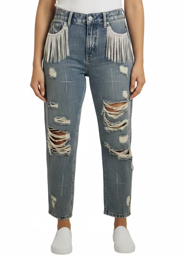 Make a statement in these standout ripped denim jeans featuring dramatic silver fringe detailing along the pockets. Designed for the bold and fashion confident, this pair blends edgy street style with a touch of glam. The heavy distressed front balances perfectly with the shimmering pocket fringe, creating movement and eye catching sparkle with every step. A tapered ankle length fit keeps the silhouette flattering and easy to style with both casual and dressy looks.