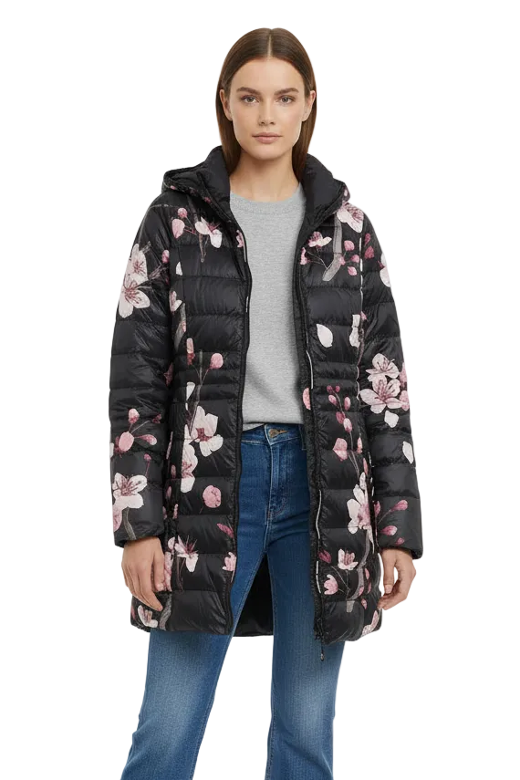Featuring a quilted construction for lightweight warmth, this jacket includes a high neckline and hood for added protection on cooler days. The longer length provides extra coverage, while the zip-front design and functional pockets make it practical for everyday wear.