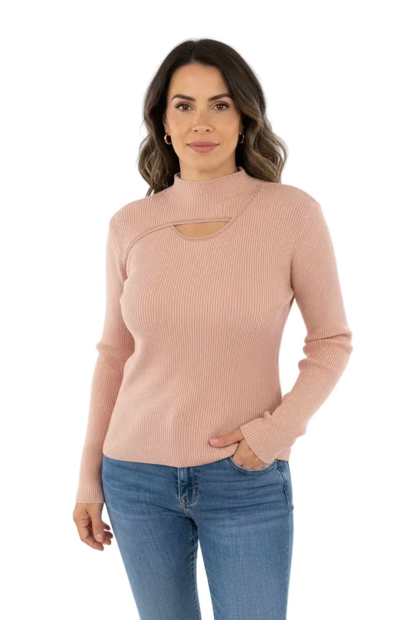 This ribbed knit top blends everyday comfort with a subtle statement detail. Designed with a high neckline and a unique asymmetric cut-out across the upper chest, it adds a modern edge while remaining easy to wear.