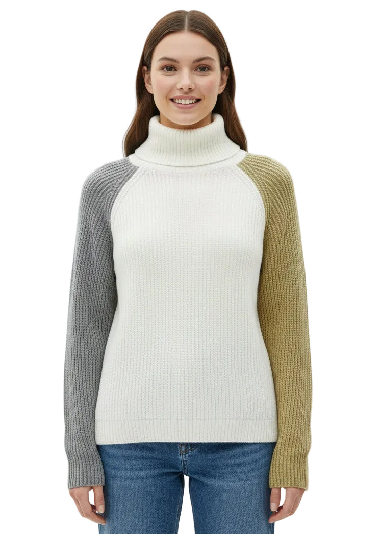 A modern knit designed with contrast panel sleeves and a soft roll neck for effortless everyday wear. This piece features a relaxed silhouette with a ribbed texture throughout, giving it both structure and comfort. Easy to style with denim, tailored pants, or layered under outerwear for cooler days.