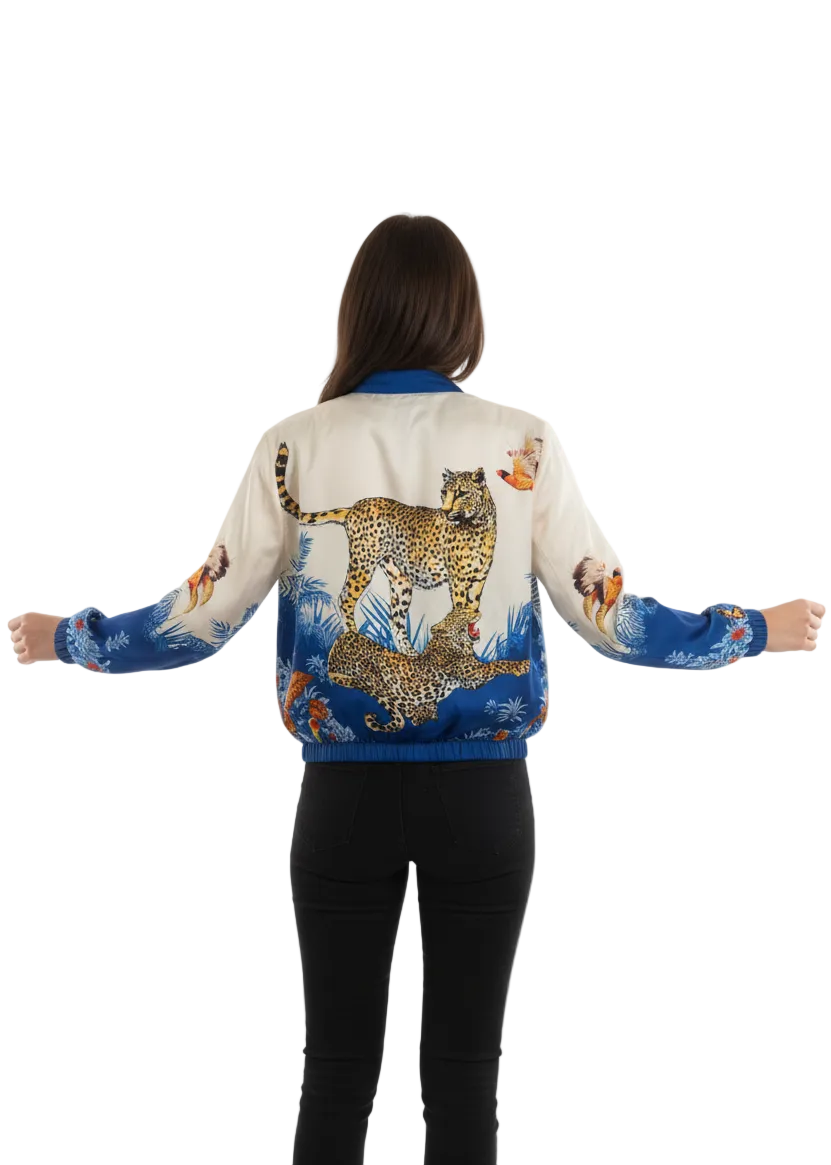 The Wild Safari Bomber Jacket is a statement outerwear piece designed to turn heads. Featuring an artistic wildlife print with bold detailing, this jacket blends effortless edge with elevated style. The lightweight construction makes it perfect for layering while still delivering impact.