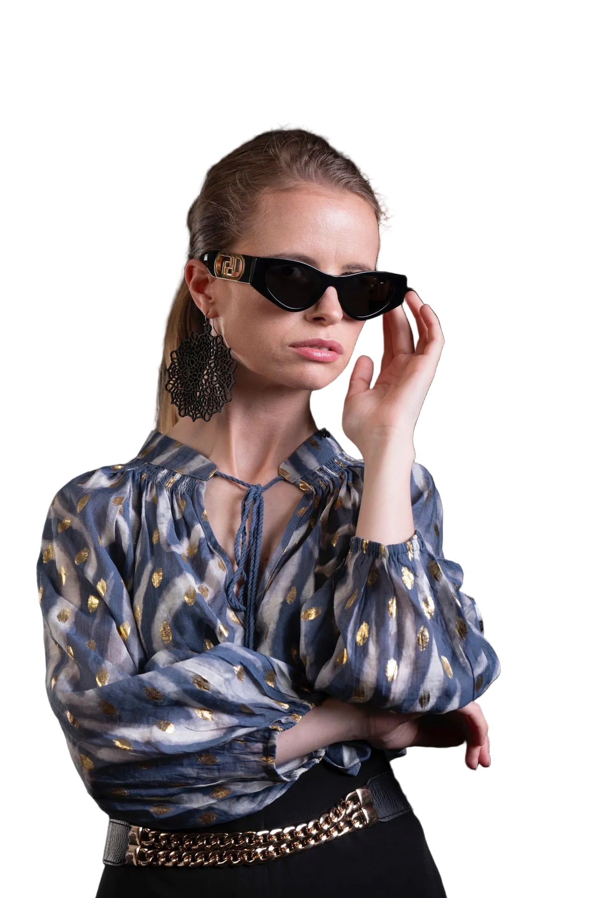 Elevate your style with this stunning bohemian-inspired blouse that combines elegance with a touch of sparkle. Crafted from lightweight chiffon, this long sleeve peasant top features a metallic polka dot print in vibrant gold foil accents against a rich blue background. The tie neck design with tassels adds a charming detail, while the flowy, loose fit ensures all-day comfort and effortless style. Perfect for both casual outings and evening wear, this boho blouse pairs beautifully with jeans, skirts, or tailored pants. Embrace the unique European-inspired design and make a statement with this eye-catching piece!