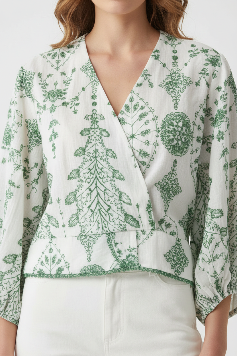 Top: Wrap-style blouse with a deep V-neck and elasticated hem for a flattering fit