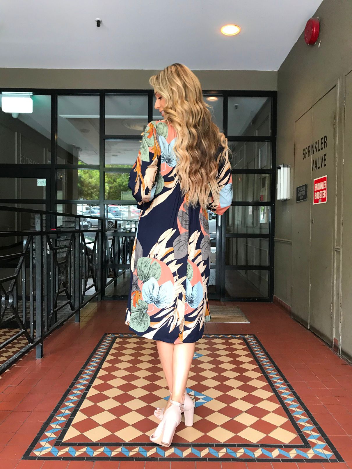 Features: 3/4 length sleeves, round neckline, and knee-length hemline