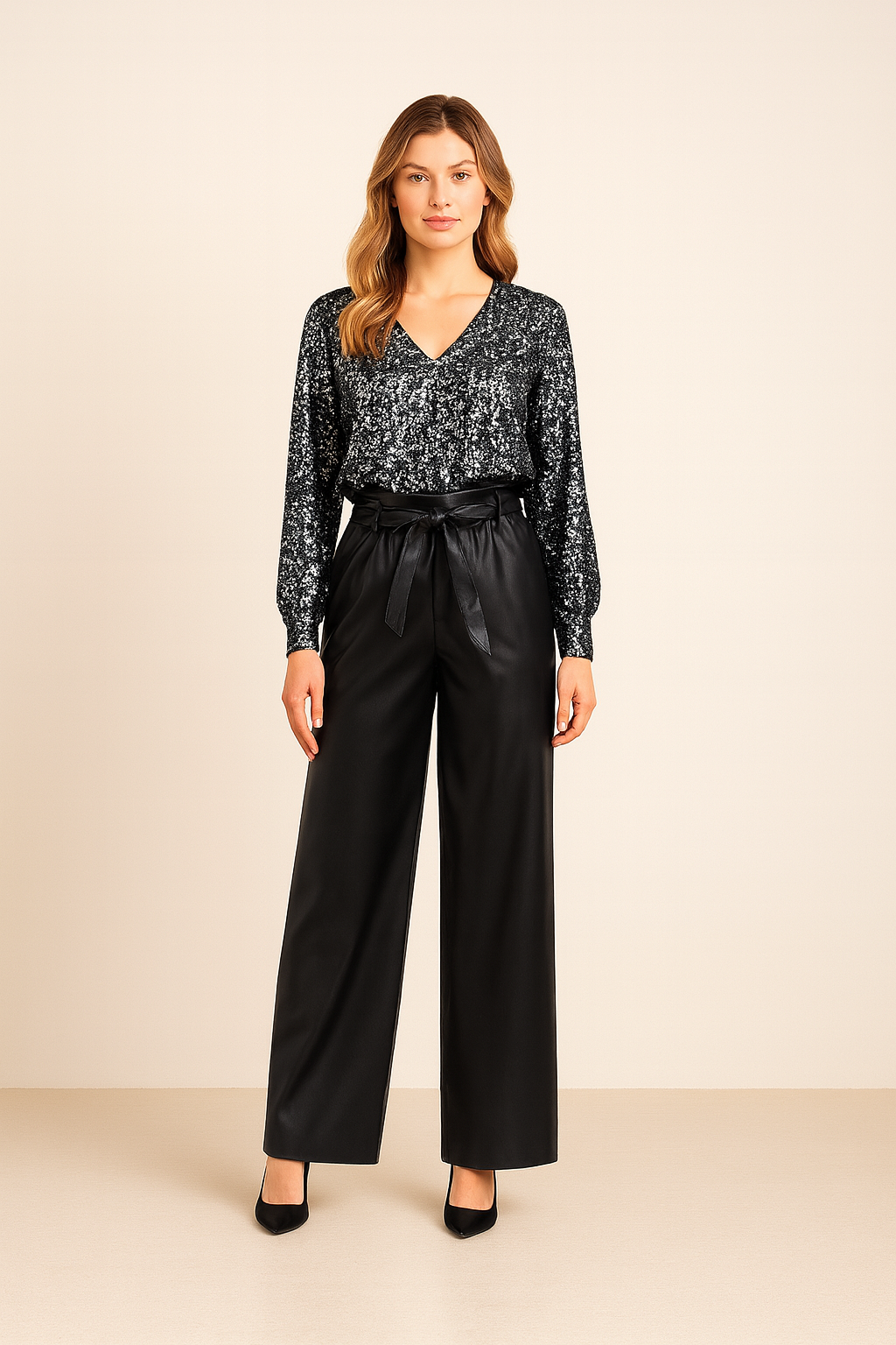 These black wide leg faux leather pants are the perfect statement piece for an elevated yet comfortable look. Designed with a soft faux leather finish and a relaxed wide leg shape, they move beautifully and flatter every body type. The elastic waistband creates an easy pull on fit and the matching tie belt adds a stylish touch. Dress them up with heels for a night out or pair with a simple tee for a chic everyday outfit.