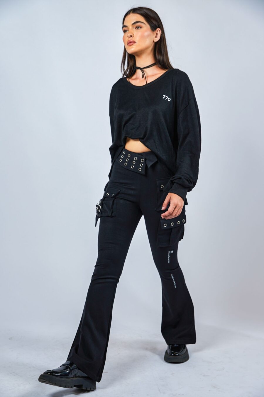 With a wide-legged silhouette for an edgy vibe and a skinny fit through the rest, this versatile piece effortlessly pairs with a bold look or adds sophistication with a blazer. It features a back and side pocket with eyelet details.